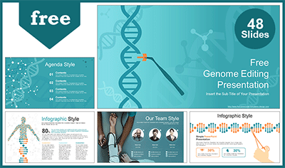 Genome Editing Medical PowerPoint Templates: This template is an illustration design based on genome editing. DNA engineering is a hot topic in recent medical science. I also think-