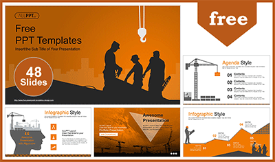 Silhouette of Construction Worker Industry PowerPoint Templates: This template represents construction in silhouette. It also contains construction-related shapes that are easily-