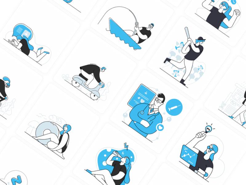 Dual tone illustrations made in filled outline style, these simple illustrations colors can be easily modified to fit your brand since all vector files are included and fully editable. Blues illustrations are made for use in website interface, app design or printed material. We tried to cover various subjects such as shopping, finance, social media, business and more. We are planning to expand this pack by adding more subjects and illustrations as updates.