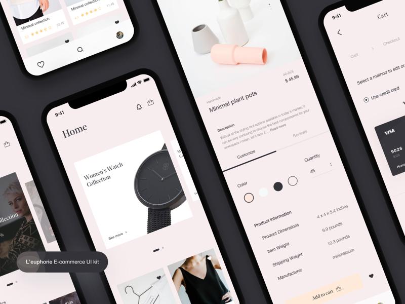 E-commerce UI kit screens and components, with a very minimal and modern trendy design.